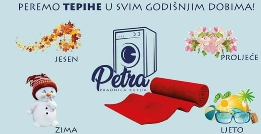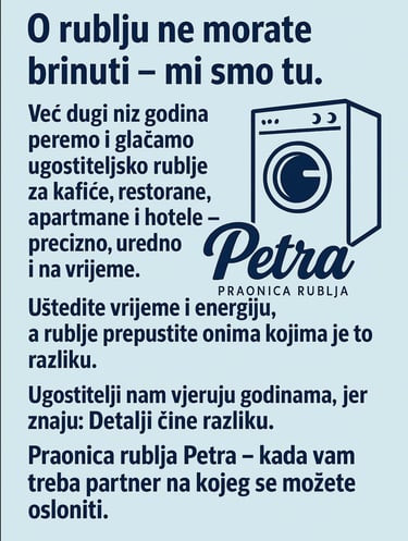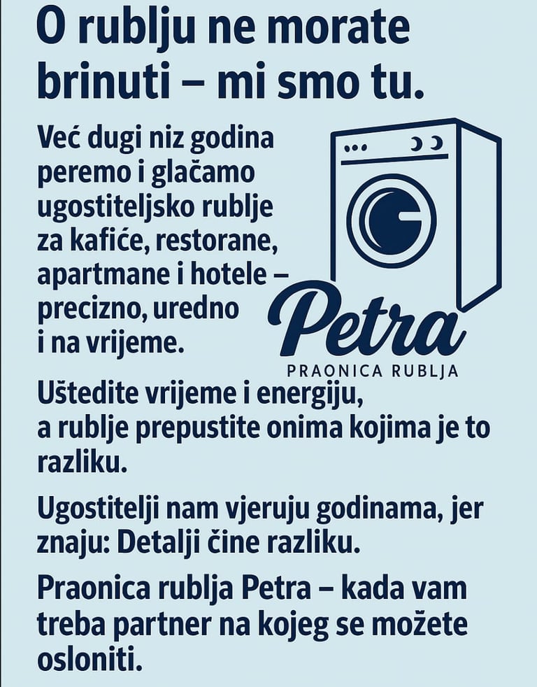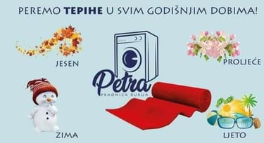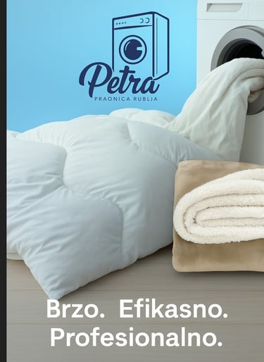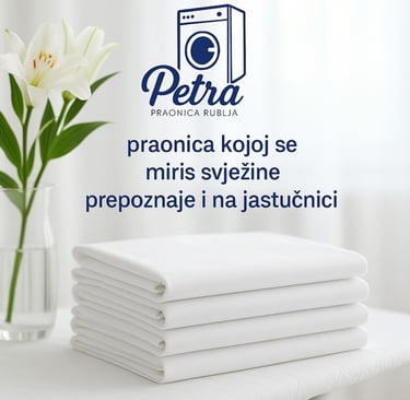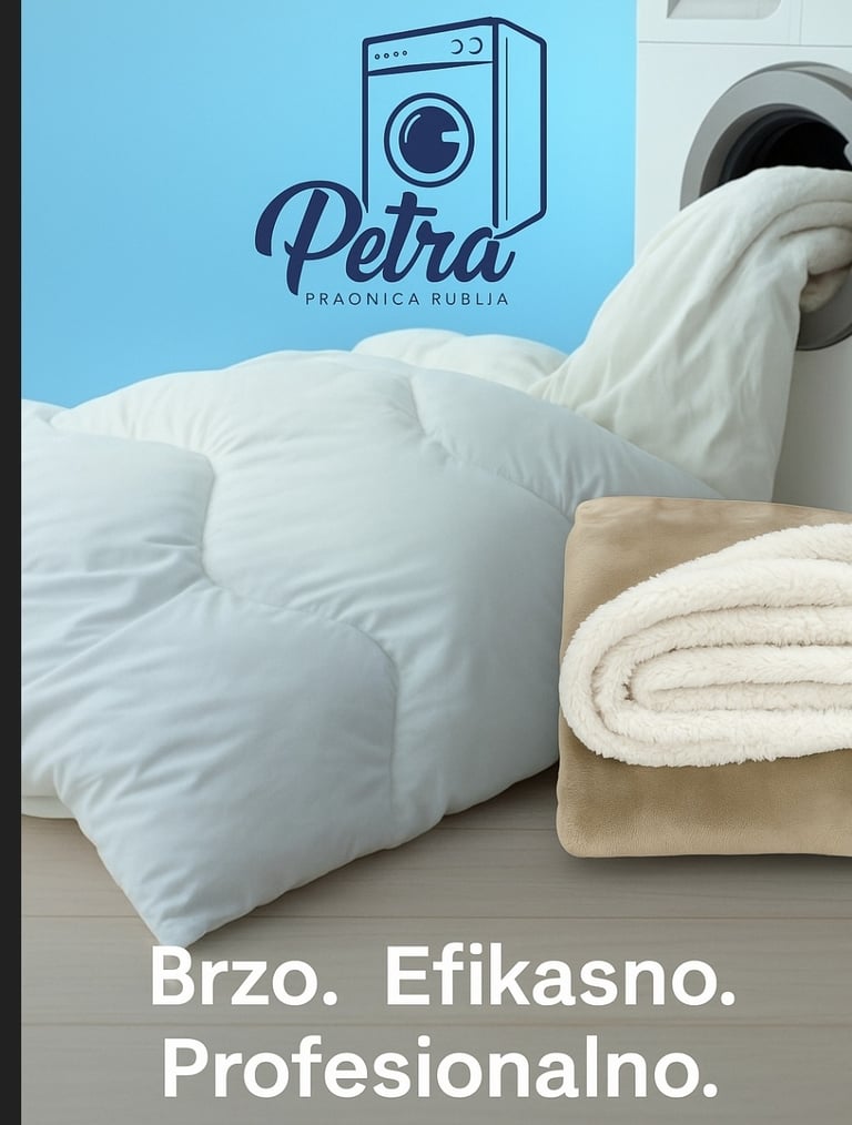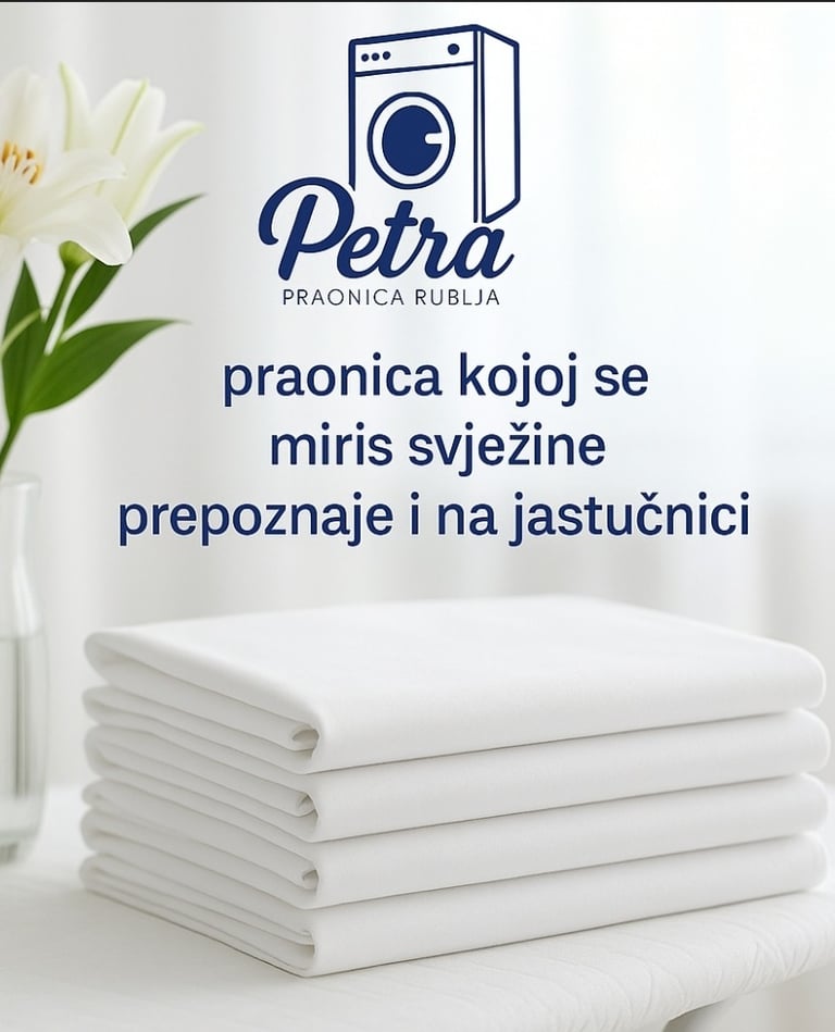 Praonica rublja Petra mjesto je gdje čistoća postaje jednostavna, a svaki komad tkanine dobiva novu svježinu i mekoću. Naša misija je olakšati vam svakodnevicu i osigurati da vaše rublje, tepisi i tekstili uvijek budu savršeno oprani, mirisni i uredni. Na jednoj adresi nudimo širok spektar pranja i čišćenja bez razmišljanja gdje ste što ostavili. Vi donesete-mi odradimo-vi pokupite sve gotovo i savršeno čisto. Naše poslovanje nudi 21.godinu iskustva,jamči kvalitetu te jednak pristup svakome artiklu. Sva sredstva koja koristimo za pranje ekološki su prihvatljiva,sigurna su za tkanine i okoliš,jer brinemo o zdravlju vaših stvari kao i o planeti. Naša praonica spoj je stručnosti, vrhunske opreme i osobne brige. Svakom klijentu i svakom artiklu pristupamo s pažnjom, jer znamo da rublje i tkanine koje nam povjeravate nisu samo materijal – one su dio vašeg doma, posla i svakodnevnog života.